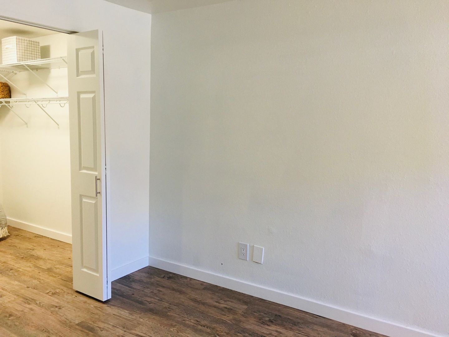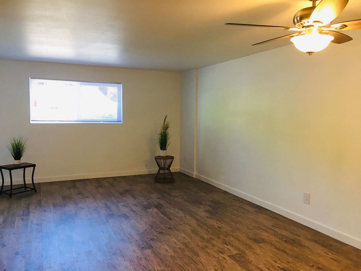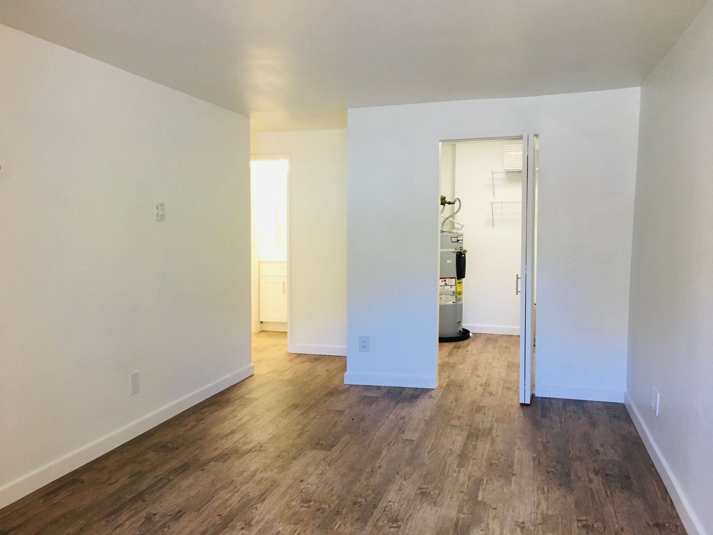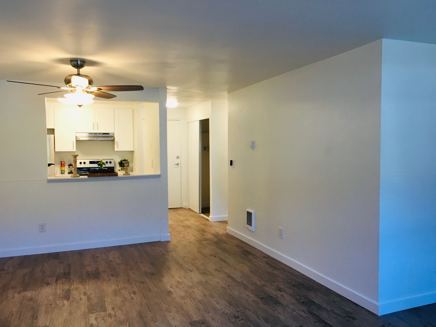 This updated two bedroom home features designer hardwood style flooring throughout, a fully equipped kitchen with stainless steel appliances, a pantry closet, a dining area with overhead ceiling fan, spacious bedrooms, an extra large primary bedroom with over sized grand closet closet, one and a quarter bathrooms and a large private patio.