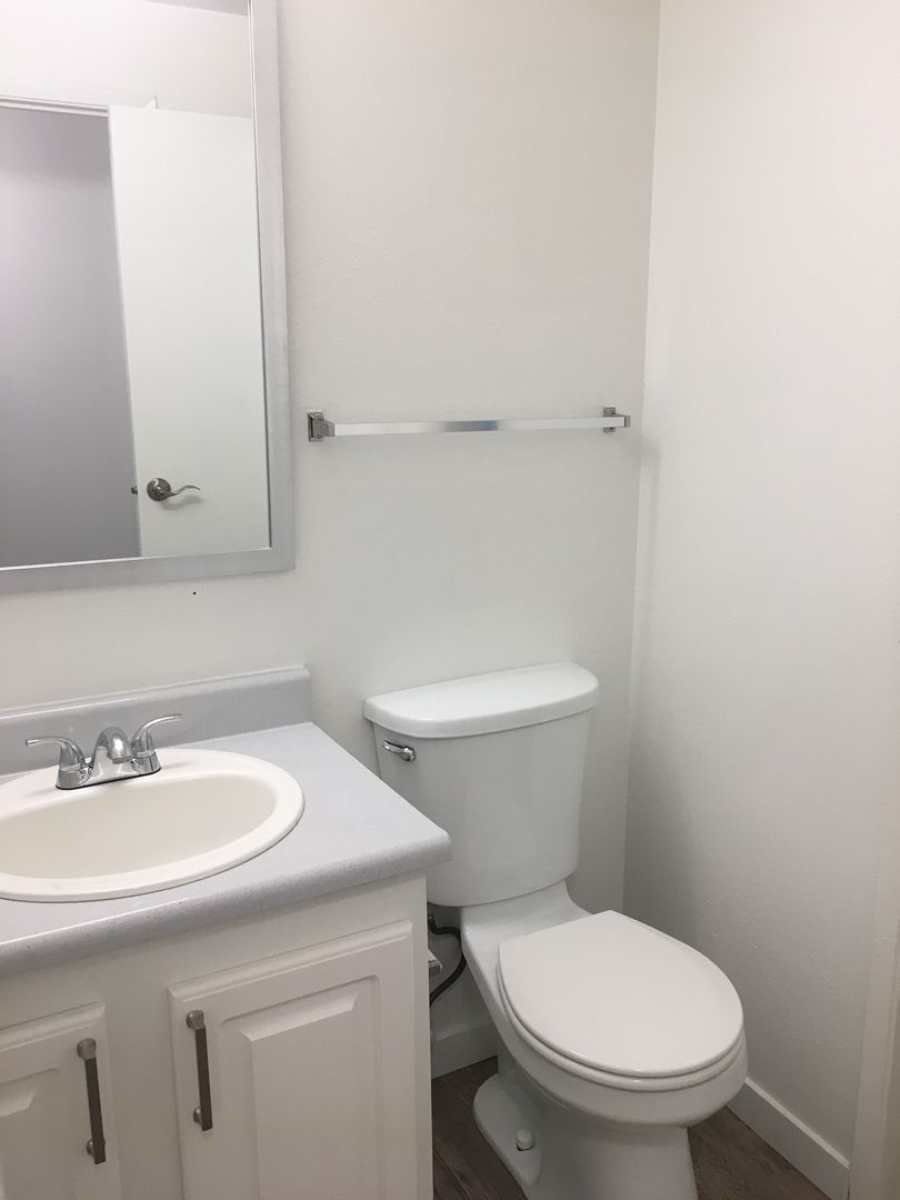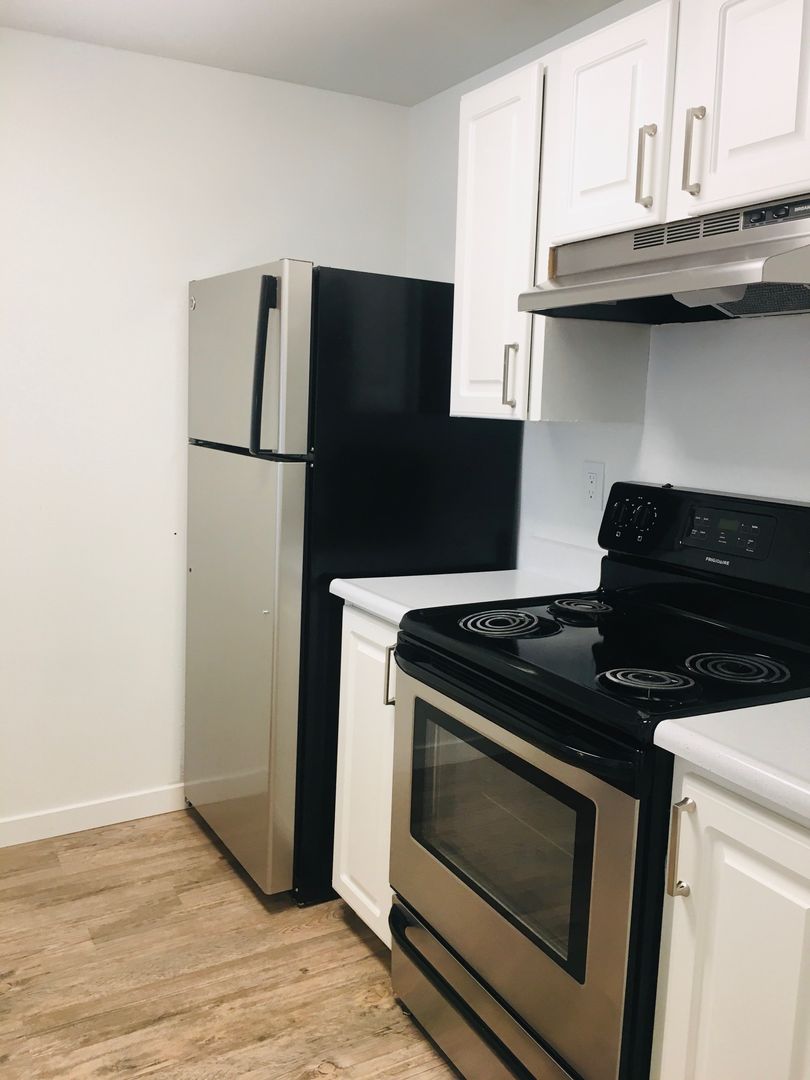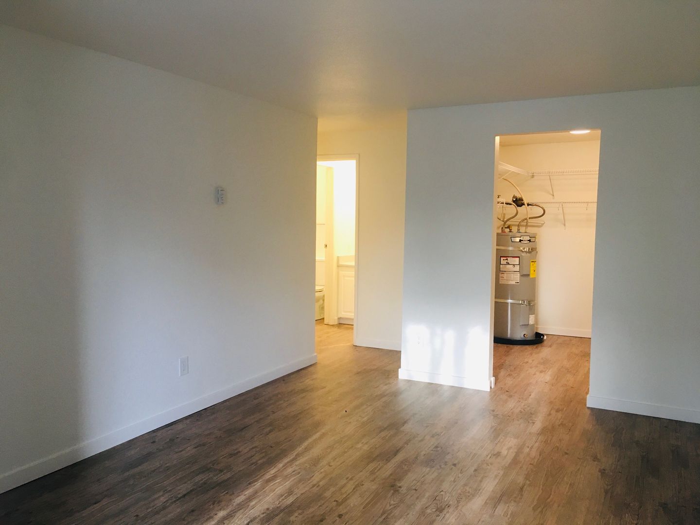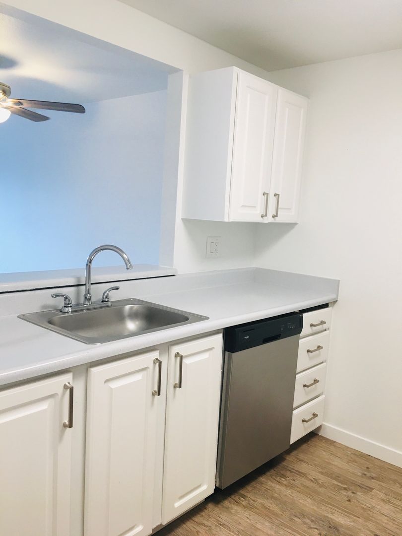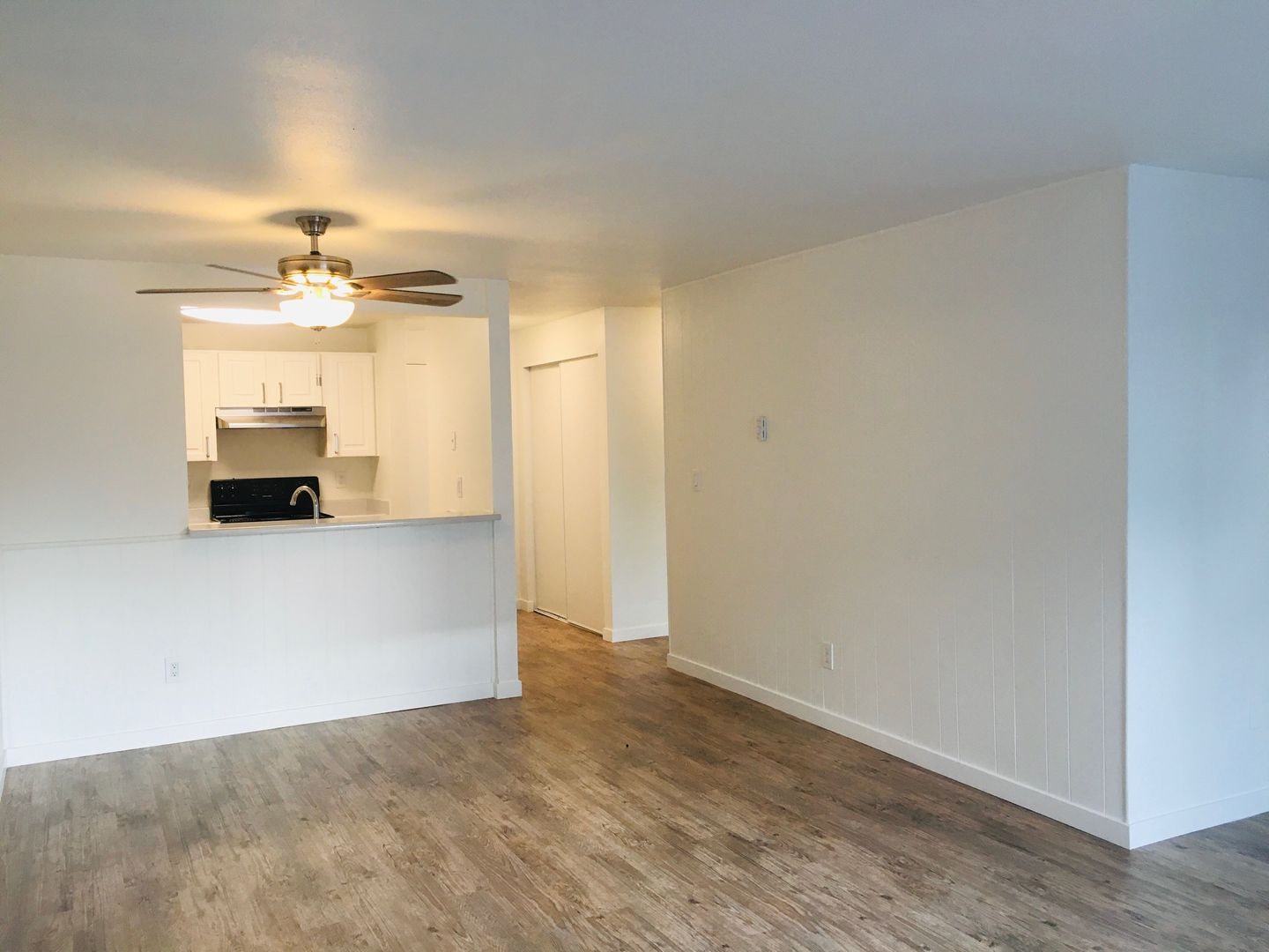 This updated two bedroom home features designer hardwood style flooring throughout, a fully equipped kitchen with stainless steel appliances, a pantry closet, a dining area with overhead ceiling fan, spacious bedrooms, an extra large primary bedroom with over sized grand closet closet, one and a quarter bathrooms and a large private patio.