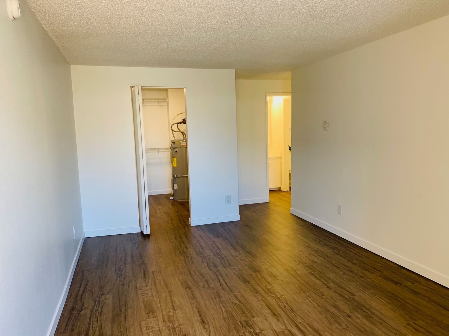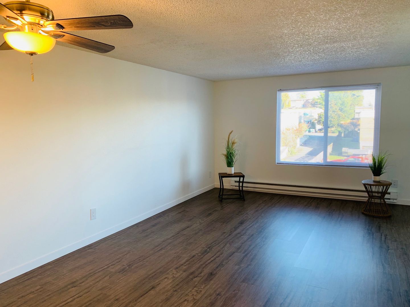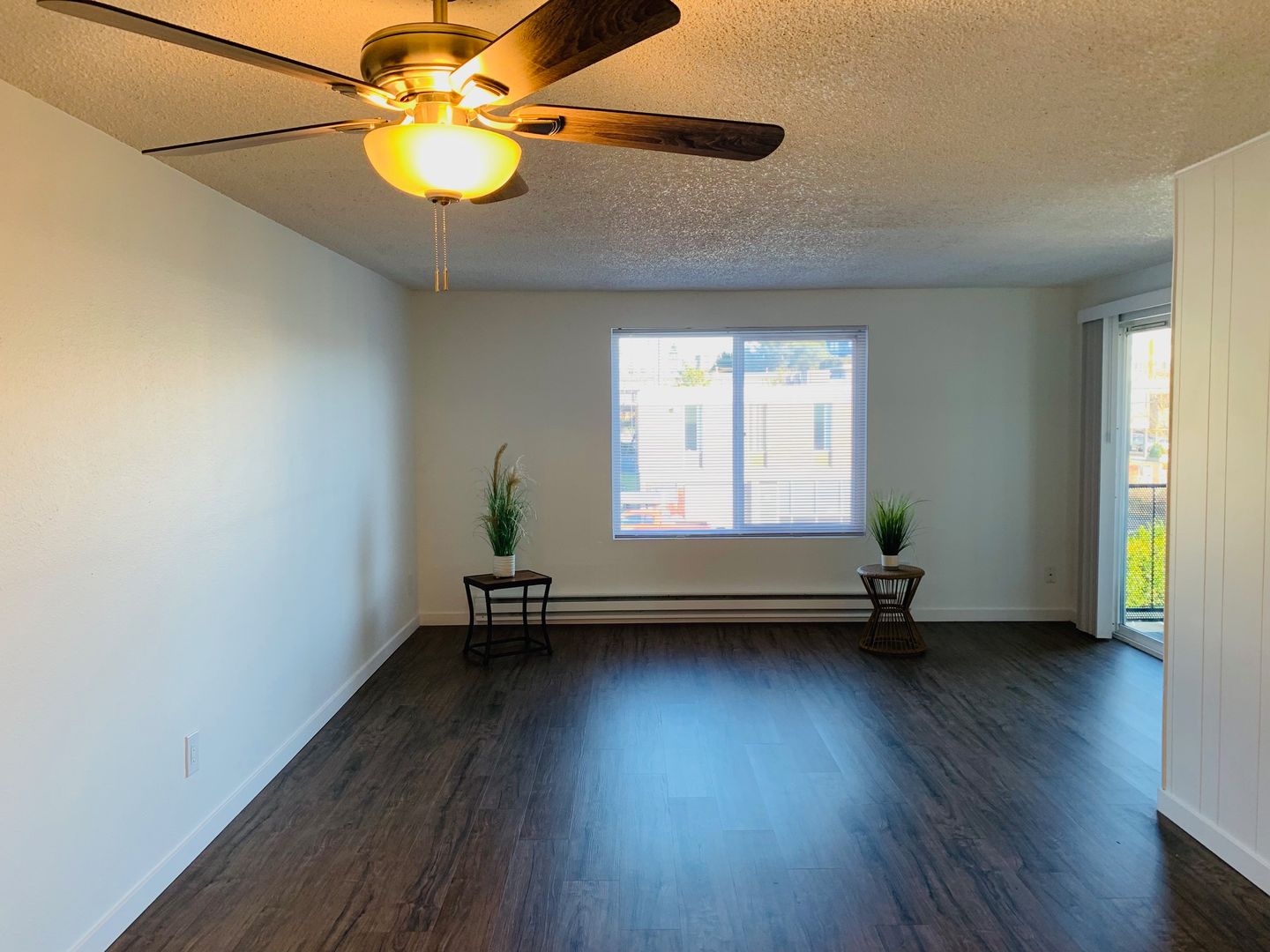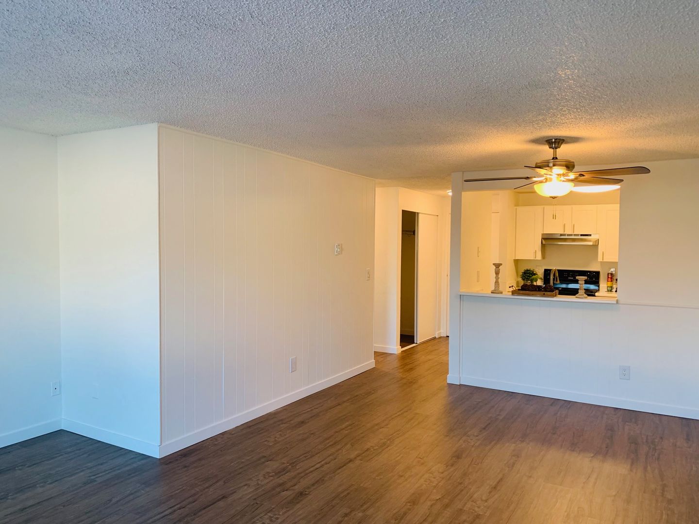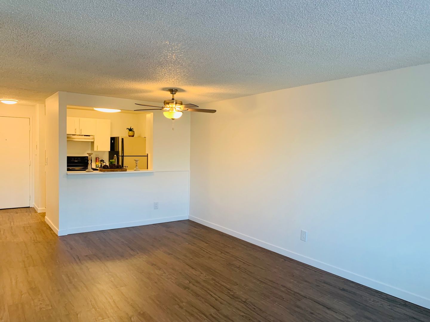 This updated two bedroom home features designer hardwood style flooring throughout, a fully equipped kitchen with stainless steel appliances, a pantry closet, a dining area with overhead ceiling fan, spacious bedrooms, an extra large primary bedroom with oversized grand closet, one and a quarter bathrooms and a large private balcony.