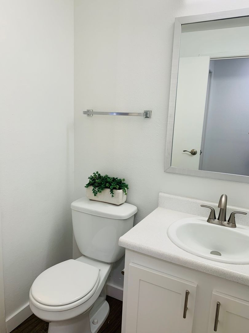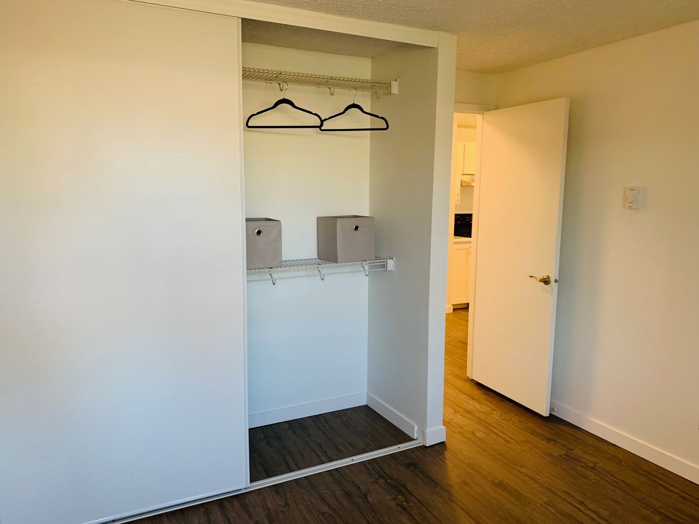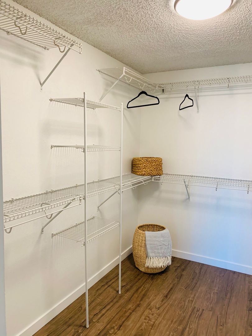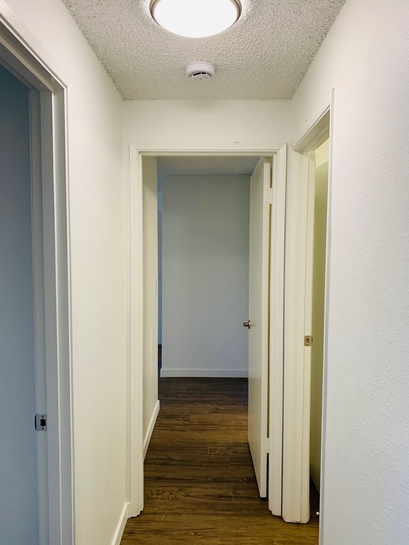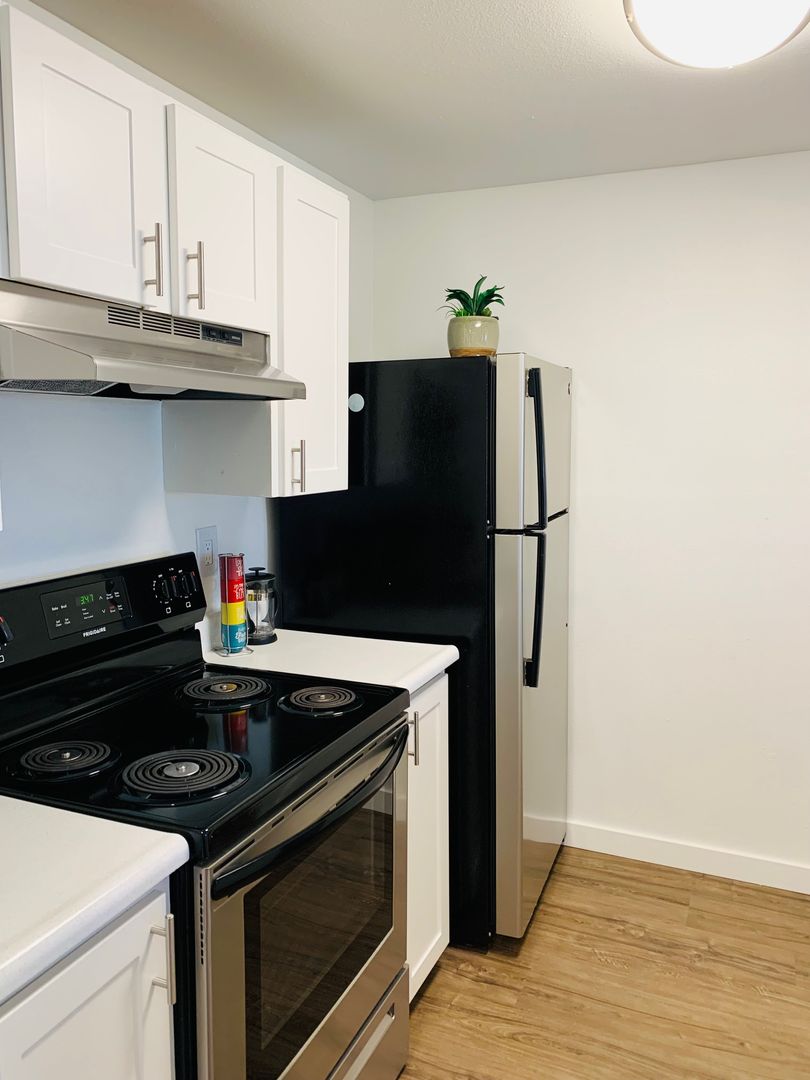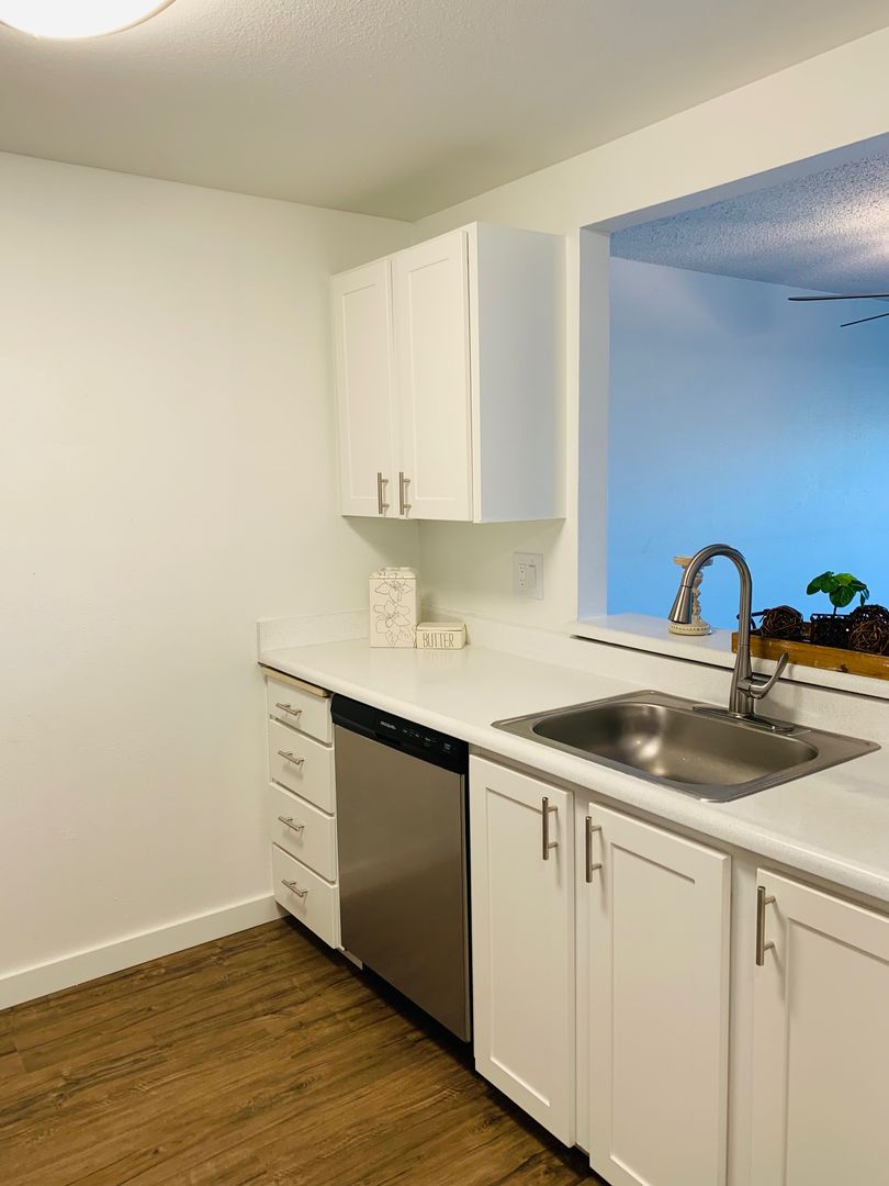 This updated two bedroom home features designer hardwood style flooring throughout, a fully equipped kitchen with stainless steel appliances, a pantry closet, a dining area with overhead ceiling fan, spacious bedrooms, an extra large primary bedroom with oversized grand closet, one and a quarter bathrooms and a large private balcony.